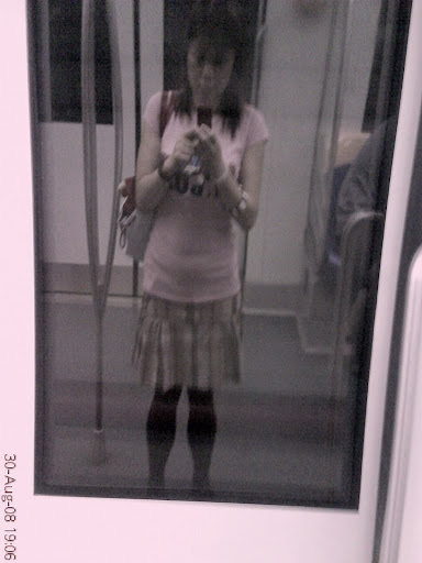 My reflection of me in the mrt..and yes, wearing the pink mr bump tee! :)